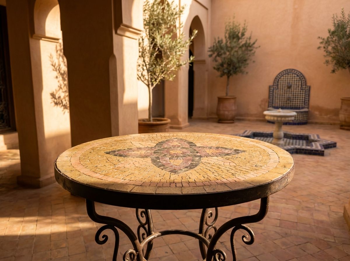 Originating from the workshops of Marrakech, this table is more than just furniture; it is a piece of cultural heritage. It perfectly serves as a unique side table in a living room, a character-rich bedside table, or a striking accent piece on a covered patio or balcony, adding a touch of exotic elegance to any space.