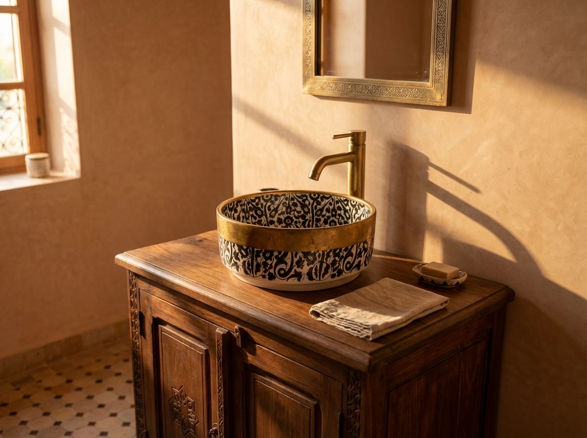 This vessel sink is more than just a functional fixture; it is a sculptural statement piece that embodies the soul of Morocco. Designed for countertop installation, it is perfect for creating a dramatic focal point in a powder room or adding a touch of exotic sophistication to a master bath. It brings the timeless beauty and artisanal spirit of the Maghreb directly into your home.