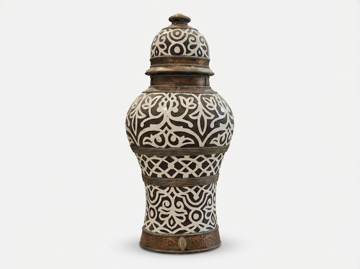 This magnificent lidded urn is a testament to the enduring legacy of Moorish craftsmanship, a true statement piece that commands attention. Born from the ancient workshops of Fes, it represents a harmonious marriage of two distinct and demanding artistic traditions. The vessel's body is a striking canvas of high-contrast inlay work, where stylized arabesque motifs of flowing vines and geometric florals—rendered in a bone or resin composite—are painstakingly set against a dark, textured background. This technique creates a visual rhythm that is both hypnotic and classically elegant. Framing and accentuating these inlaid sections are bands of richly detailed metalwork, crafted from copper or brass alloys that have been treated to achieve a warm, aged patina. Each band is a masterpiece of repoussé and chasing, where the master artisan, or 'Maalem,' has hammered the metal from the reverse to raise intricate floral patterns and then refined the details from the front. The domed lid, topped with a prominent finial, and the sturdy base are similarly adorned, grounding the piece with a sense of opulent weight and history. More than just a decorative object, this urn is a narrative of Moroccan heritage, echoing the architectural splendor of the Alhambra and the bustling energy of the souks. It is a labor of love, taking weeks to complete, and is destined to be a cherished heirloom, bringing a touch of exotic sophistication and timeless artistry to any interior space.