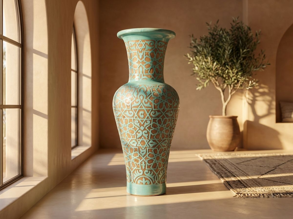 Make a bold statement with this magnificent Moroccan floor vase, a true masterpiece of artisan craftsmanship. Standing tall, its presence is commanded by a striking contrast: a luminous, deep turquoise glaze that offsets the raw, earthy Natural Clay tones of the hand-carved geometric patterns. The design is a classic Moorish 'girih' or star pattern, meticulously incised into the clay body before firing, creating a tactile depth that is as captivating to the touch as it is to the eye.