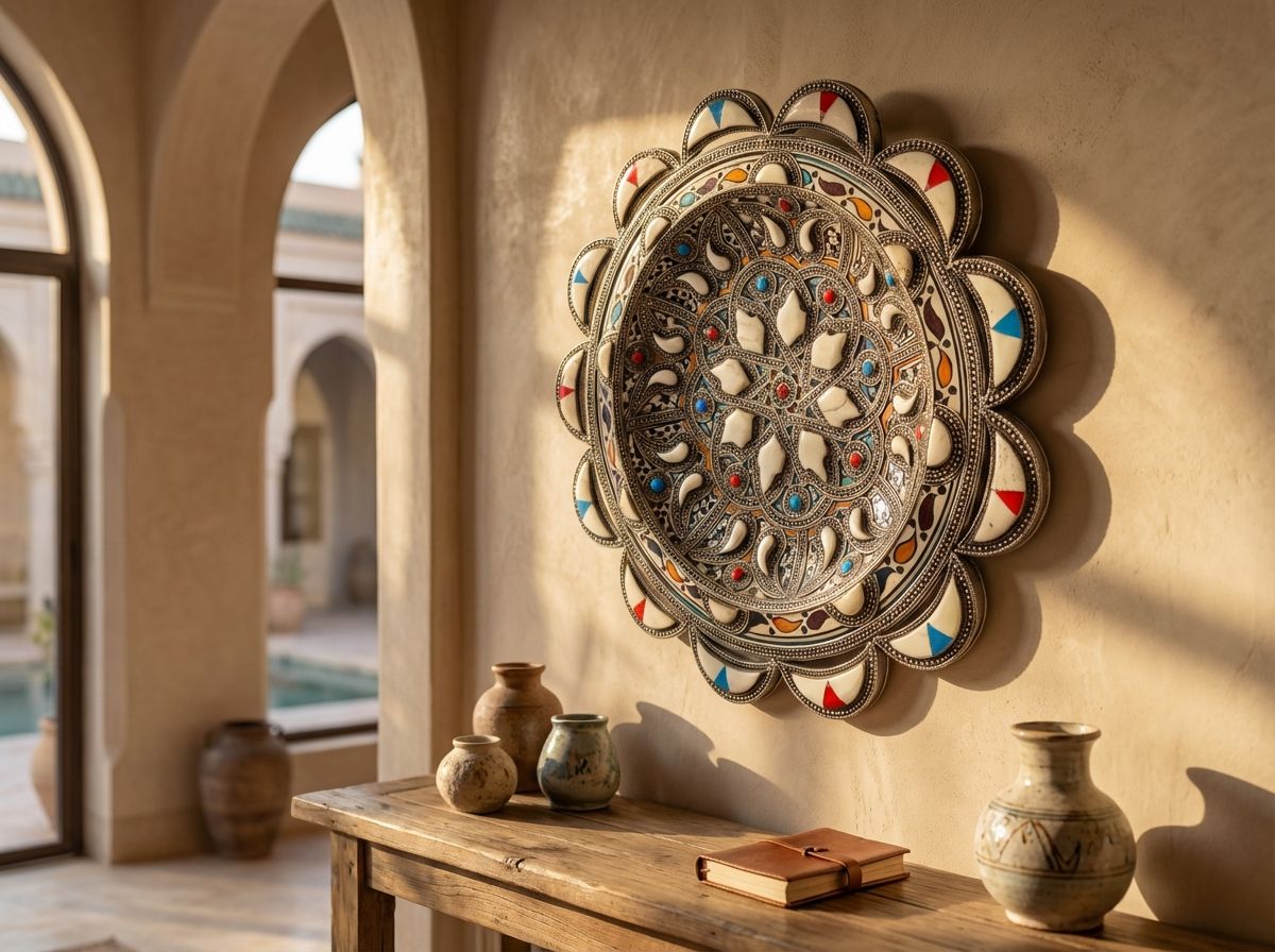 More than just a decorative object, this charger is a piece of North African soul. The central star pattern is a classic Moorish motif, symbolizing balance and the cosmos. Whether hung as a central statement piece on a wall or placed on a stand, it transforms any space, catching the light and radiating an aura of old-world grandeur and exotic elegance. It is a true collector's piece, destined to be a cherished heirloom.