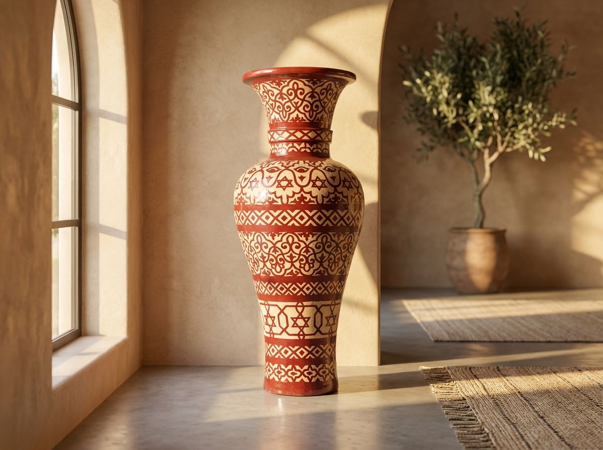 A monumental, hand-painted ceramic floor vase featuring traditional red and beige geometric patterns.