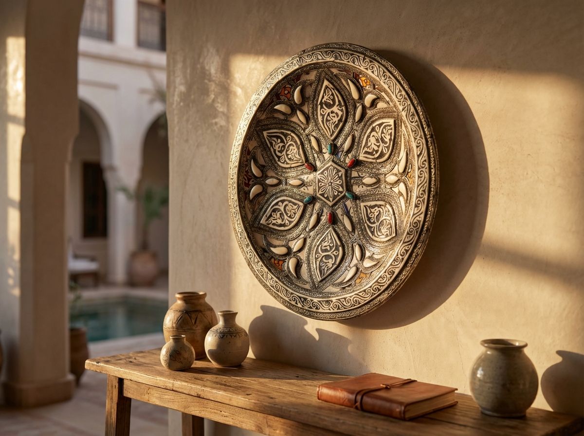 Transport yourself to the ancient medina of Fez with this magnificent ceremonial platter, a true masterpiece of Moroccan artisanry. This substantial piece is not merely decorative but a testament to centuries-old techniques passed down through generations of 'Maalems' (master craftsmen). It is designed to be a captivating centerpiece or a striking wall hanging that commands attention in any setting.