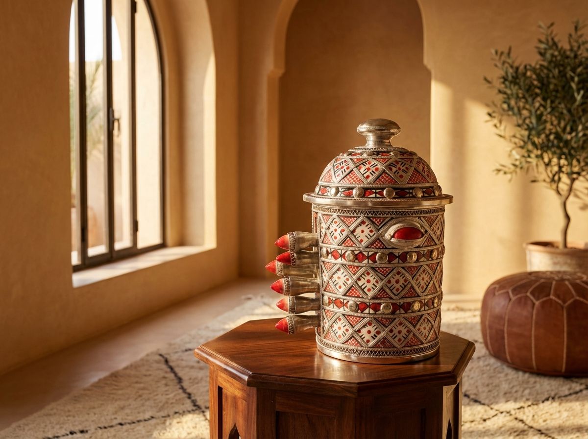 More than just a container, this piece is a testament to the enduring traditions of Moroccan artisans who blend ancient geometric symbolism with personal, sometimes surprising, expression. It serves as an exceptional decorative centerpiece for a mantel or console, or as a treasured repository for jewelry and other valuables, promising to be a captivating conversation starter in any home.