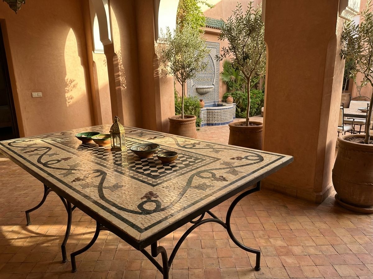 This magnificent rectangular table is a testament to the enduring legacy of Roman mosaic art in Morocco. Handcrafted from thousands of individually cut natural stone tesserae, it is a statement piece that blends geometric precision with organic beauty. The substantial tabletop is built to last, offering a durable and timeless surface for dining or display, suitable for both indoor elegance and covered outdoor living spaces.